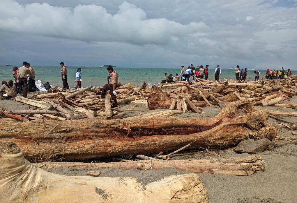 Ratusan Pramuka Bantu DLH Tangani Kiriman Kayu Pasca Banjir Di Pantai Pasie Nan Tigo