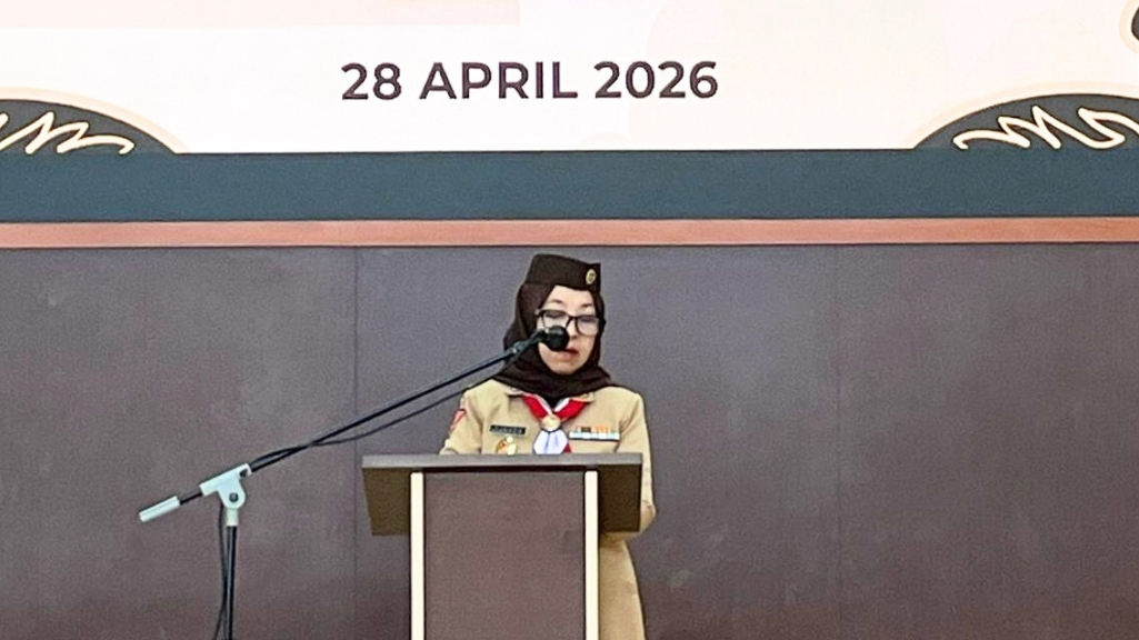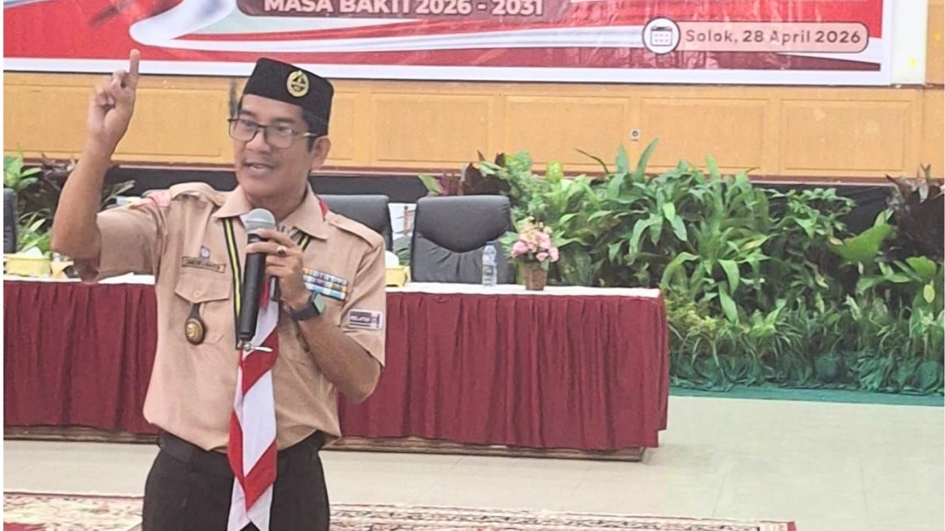 Sijunjung, (28/04/26) — Wakil Ketua Bidang Pembinaan Anggota Dewasa (Binawasa) Kwartir Daerah (Kwarda) Gerakan Pramuka Sumatera Barat, Kakak Firsta, menyampaikan sambutan Ketua Kwarda Sumbar dalam kegiatan Musyawarah Cabang (Muscab) Gerakan Pramuka Kabupaten Sijunjung yang digelar dengan penuh khidmat dan semangat kebersamaan.